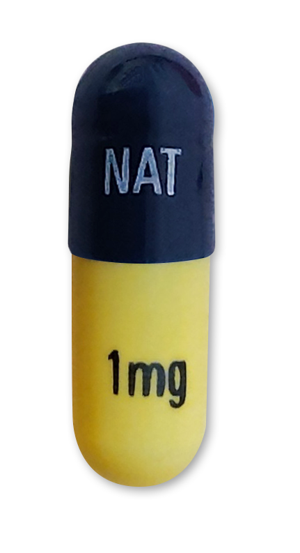 Dark blue cap and yellow body printed with “NAT” with white ink on cap and “1mg” with black ink on body of the capsule