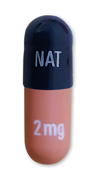 Dark blue cap and orange body printed with “NAT” with white ink on cap and “2mg” with white ink on body of the capsule