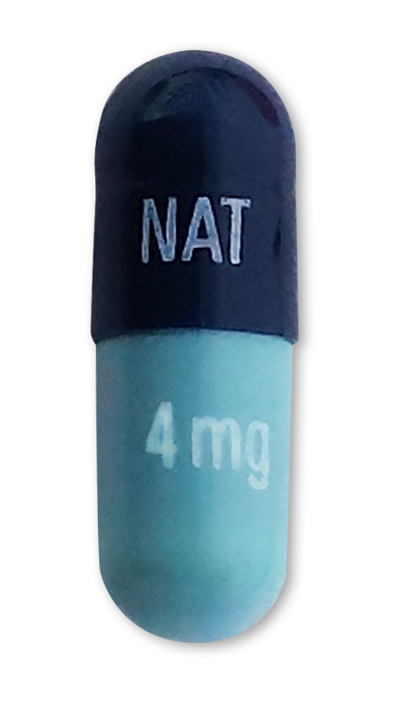 Dark blue cap and blue body printed with “NAT” with white ink on cap and “4mg” with white ink on body of the capsule